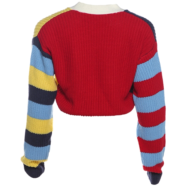 Elevate your boutique offerings with this eye-catching, multi-colored striped knit cardigan. Designed for the fashion-forward crowd, this cropped cardigan features bold, vibrant stripes in red, blue, yellow, and navy for a statement-making look. The color-blocked design, paired with a flattering fit and cozy knit texture, makes it a versatile must-have for cooler days. Whether paired with high-waisted jeans or a skirt, this cardigan promises to turn heads.