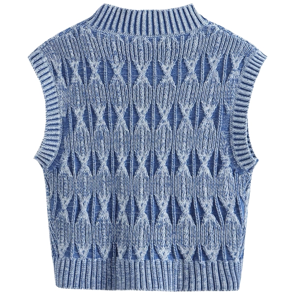 Enhance your boutique with this Vintage Knit Sleeveless Sweater, a perfect fusion of cozy texture and chic design. Crafted from premium knit fabric, this sweater features a beautiful intricate pattern with a modern high-neck cut that delivers both warmth and style. The soft blue tones and delicate knitwork create a versatile piece that complements various outfits, making it an ideal addition to any fashion-forward boutique collection.