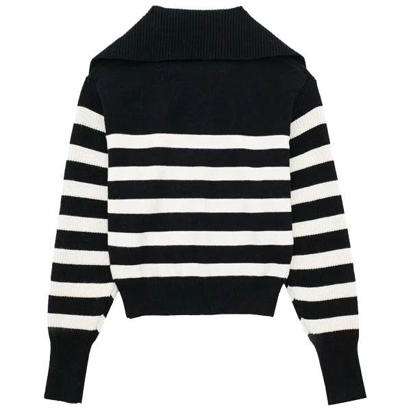 Introduce your boutique customers to this stunning women’s knit sweater with bold black and white stripes, designed for the chic fashionista. Featuring a classic horizontal stripe pattern and a stylish zip-up collar, this sweater is both timeless and trendy. The zip collar allows for versatility, offering the option to wear it as a cozy turtleneck or relaxed V-neck, perfect for any season. The ribbed cuffs and hem ensure a snug fit, while the soft knit fabric provides ultimate comfort and warmth. This piece will become a staple in your boutique, ideal for customers looking for a sophisticated yet effortless style.