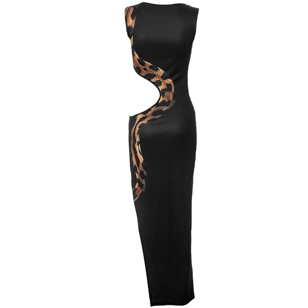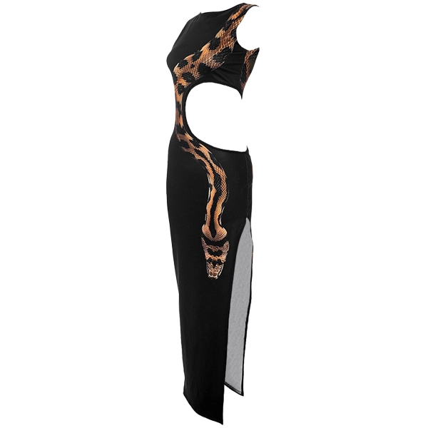 Make a striking statement with this edgy snake-print cutout dress! Designed to turn heads, this dress features a bold snake pattern that winds around the side, leading to a daring side cutout. Crafted from a smooth, figure-hugging fabric, it highlights your curves while offering ultimate comfort. The sleek sleeveless silhouette and mid-length hem create a contemporary, high-fashion look perfect for night outings or special occasions. Whether you’re aiming for an avant-garde style or a fearless, bold appearance, this dress is the ultimate showstopper.