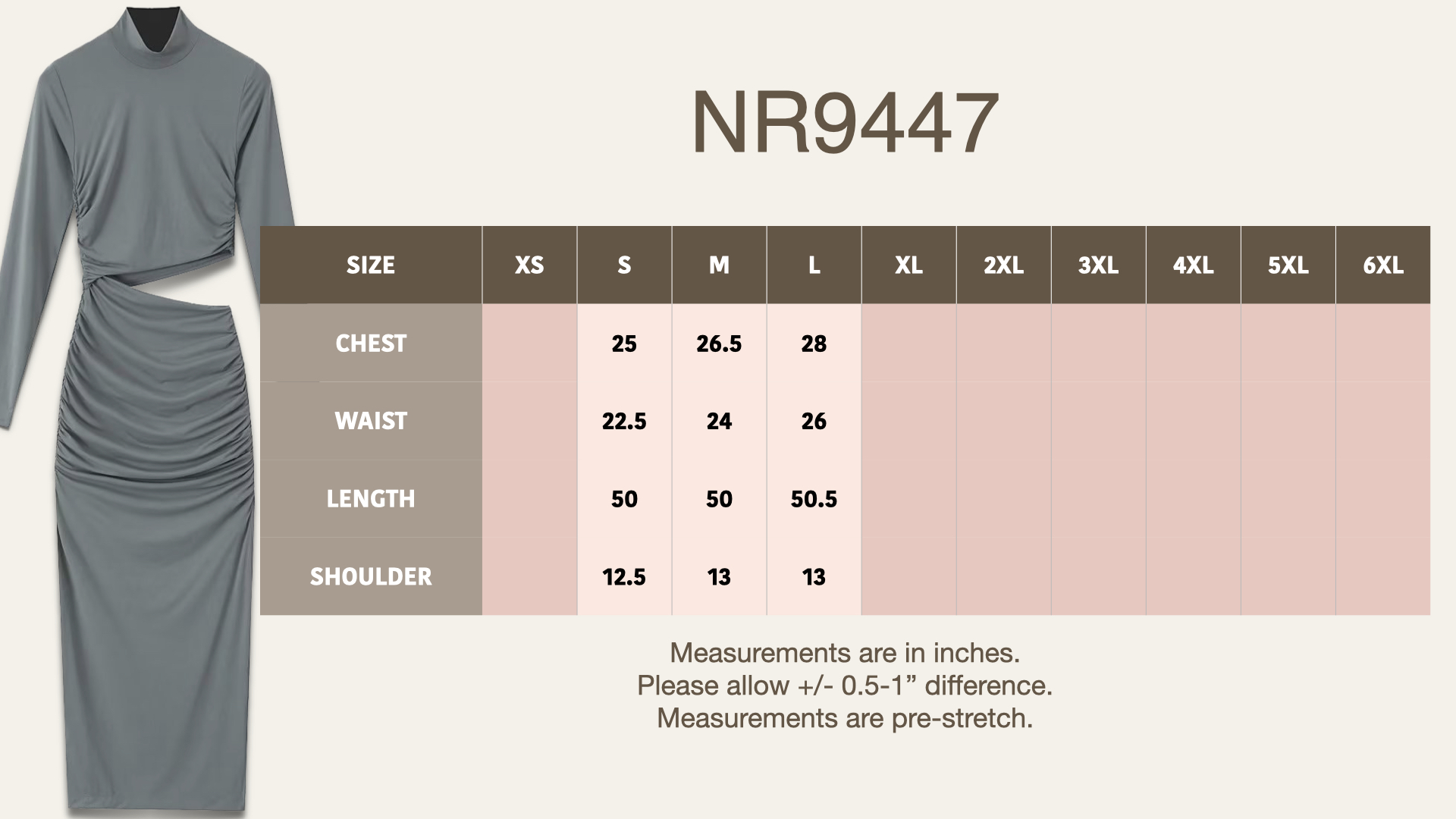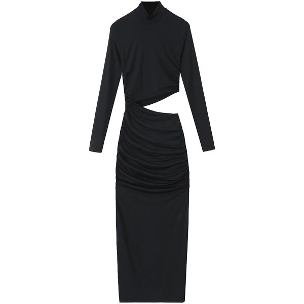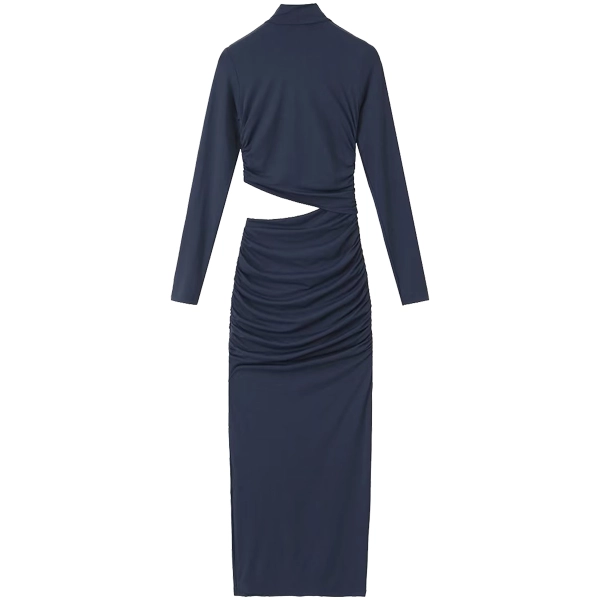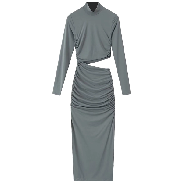 Elevate your inventory with this chic women’s long-sleeve cut-out ruched dress. This sleek and modern design features an asymmetrical cut-out at the waist that adds a daring touch, while the ruched detailing along the skirt creates a flattering silhouette. Crafted from soft and comfortable fabric, this dress effortlessly transitions from day to night. Available in timeless shades of black, grey, and navy, it’s perfect for any fashion-forward wardrobe.