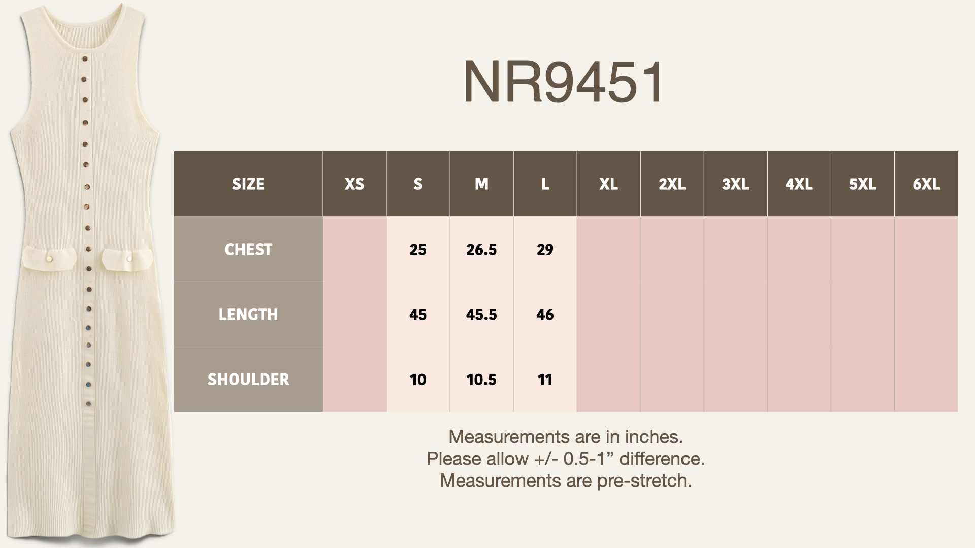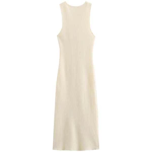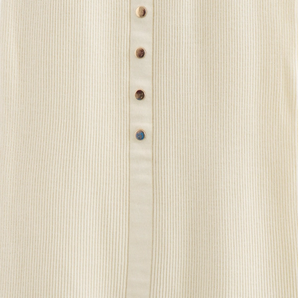 Step into effortless elegance with this sleeveless button-down ribbed knit dress. Designed in a timeless cream hue, this dress exudes sophistication while maintaining comfort. The slim fit design gracefully hugs your curves, creating a flattering silhouette. Featuring a button-down front with delicate metallic accents, this dress is ideal for a chic daytime look or a casual evening out. The addition of charming front pocket details adds a playful yet functional touch, making it a versatile piece for any wardrobe.