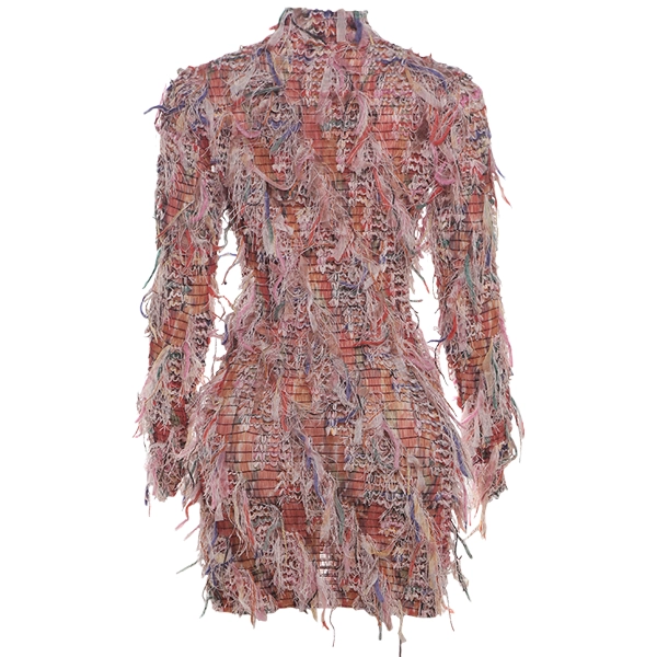 Introduce a burst of artistic flair to your boutique collection with our Whimsical Fringe Statement Dress. This high-fashion piece boasts an intricate mesh base adorned with a vibrant cascade of multi-textured fringe, delivering an effortlessly dramatic look. The unique patchwork-like design combines shades of pink, red, and pastel hues, creating a one-of-a-kind masterpiece that’s perfect for customers seeking bold, standout styles.