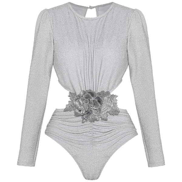 The long-sleeve monokini features a ruched design and a statement floral applique at the waist, highlighting feminine curves with grace. Its delicate open-back detail and adjustable ties ensure a custom fit for every customer. Paired with the high-waisted wrap skirt, this ensemble transitions seamlessly from the water to chic seaside dining.