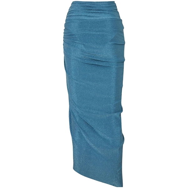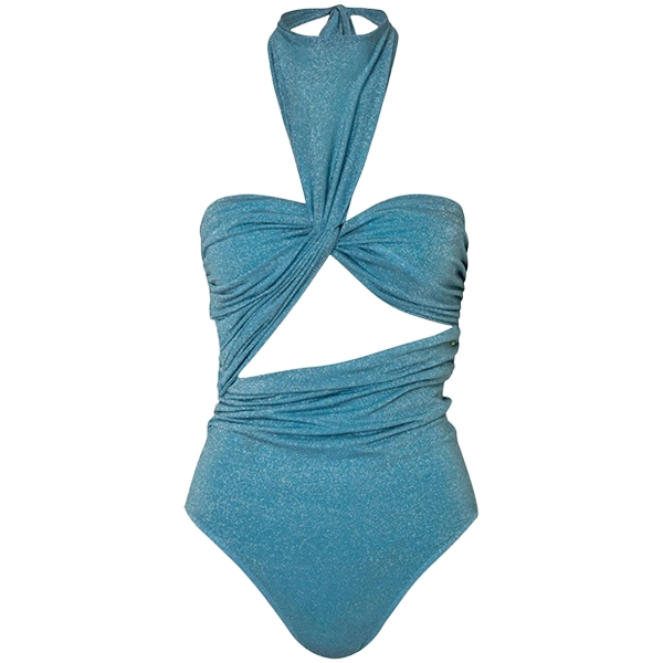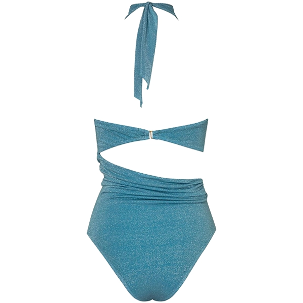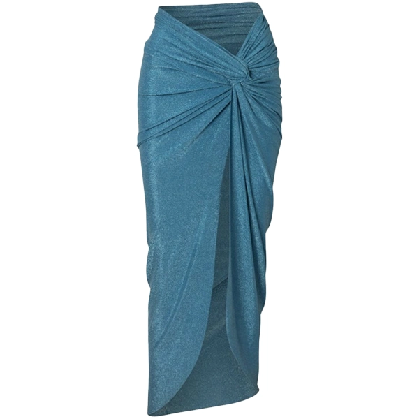 Make waves in style with this shimmering swimwear set designed for boutiques catering to trend-forward women. This two-piece ensemble features a halter wrap one-piece swimsuit that contours the body while showcasing intricate wrap detailing for a sophisticated silhouette. The set includes a ruched high-waist skirt, perfect for a quick transition from poolside lounging to beachfront dining. The glittering finish adds a touch of luxury, making it a standout choice for customers seeking unique, eye-catching designs.