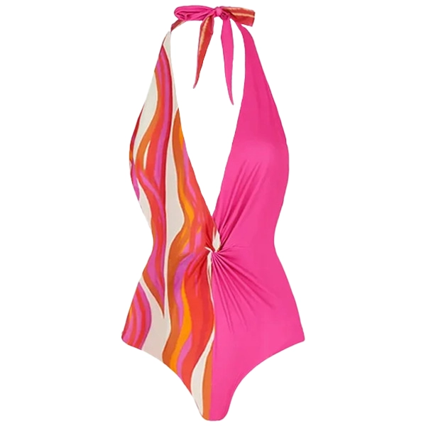 Give your boutique a pop of color and style with this eye-catching wholesale women’s swimwear set. Designed for the modern beachgoer, this set features a sleek halter one-piece swimsuit with a flattering deep V-neck and a twist-front detail that enhances curves effortlessly. The matching flowy cover-up adds a touch of elegance with its breezy silhouette, making it perfect for poolside lounging or a stroll on the boardwalk.