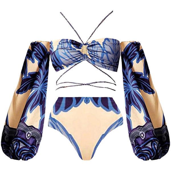 Add an exclusive touch of boho elegance to your boutique with this three-piece swimwear set, designed for trendsetters who love fashion-forward resort wear. Featuring a stunning off-shoulder long sleeve bikini top, high-waisted bikini bottoms, and flowy wide-leg pants, this set is a must-have for luxury beachwear collections.