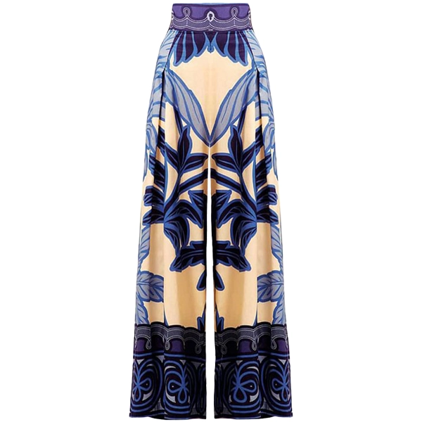 With bold blue botanical prints on a creamy base, this set exudes effortless sophistication, making it the perfect choice for poolside lounging, yacht getaways, or tropical vacations. The long-sleeve crop top features a ruched bust and adjustable crisscross straps, offering both support and a flattering fit. The high-waisted bikini bottom provides moderate coverage while elongating the legs. Completing the look, the matching palazzo pants add an extra level of glamour with flowy fabric, a high waist, and a boho-inspired border hem.